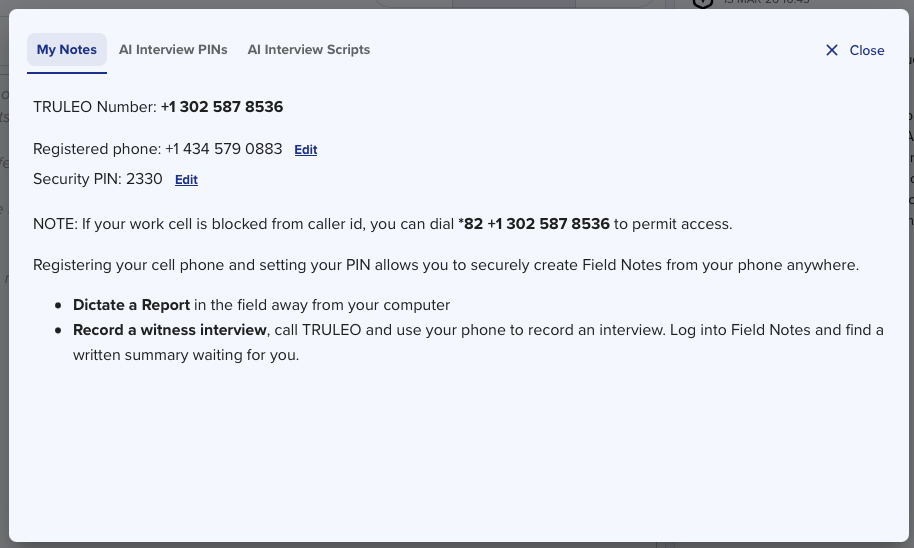 The instructions explain that registering your cellphone and setting the PIN lets you dictate reports from the field and record witness interviews using your phone. When you call TRULEO, the system will save audio and generate a written summary.