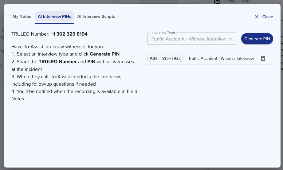In the AI Interview PINs tab, TruAssist can conduct witness interviews for you.