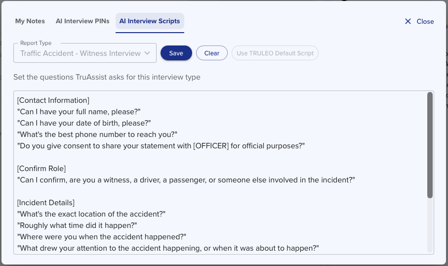 The AI Interview Scripts tab allows you to tailor the questions that TruAssist will ask witnesses.