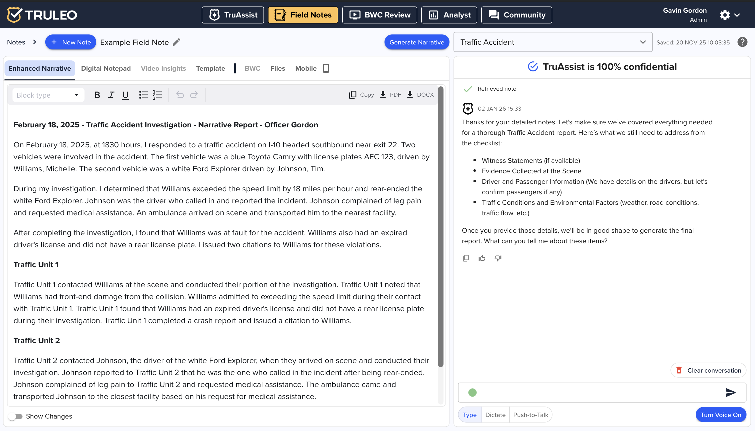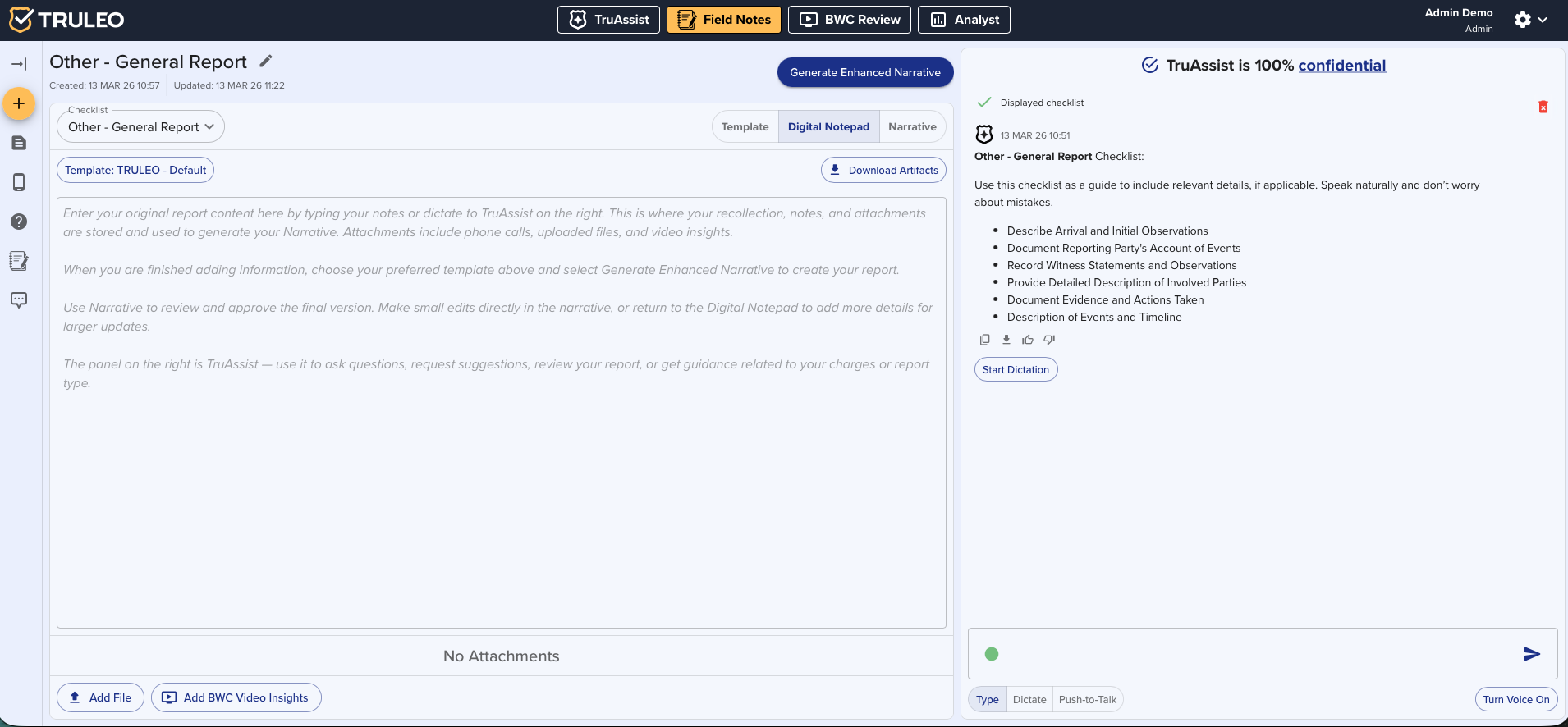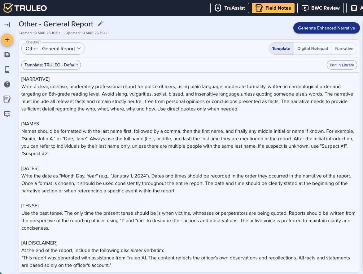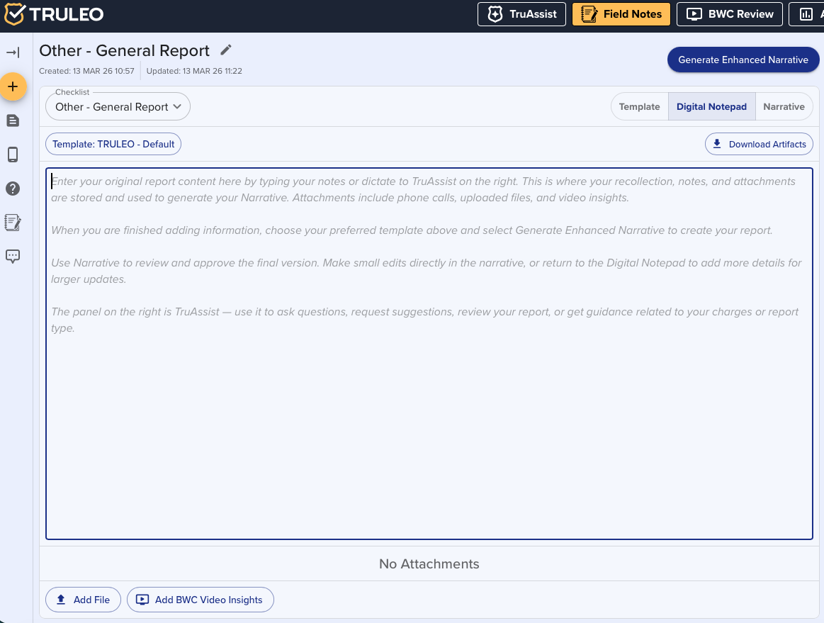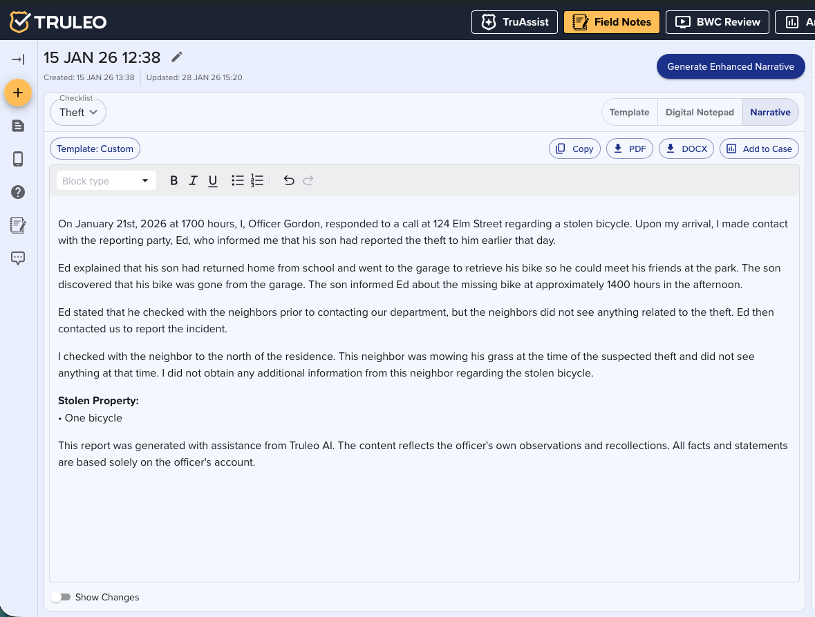 The Enhanced Narrative tab is the central hub where TRULEO transforms your field notes into a polished, agency-ready narrative. By combining: