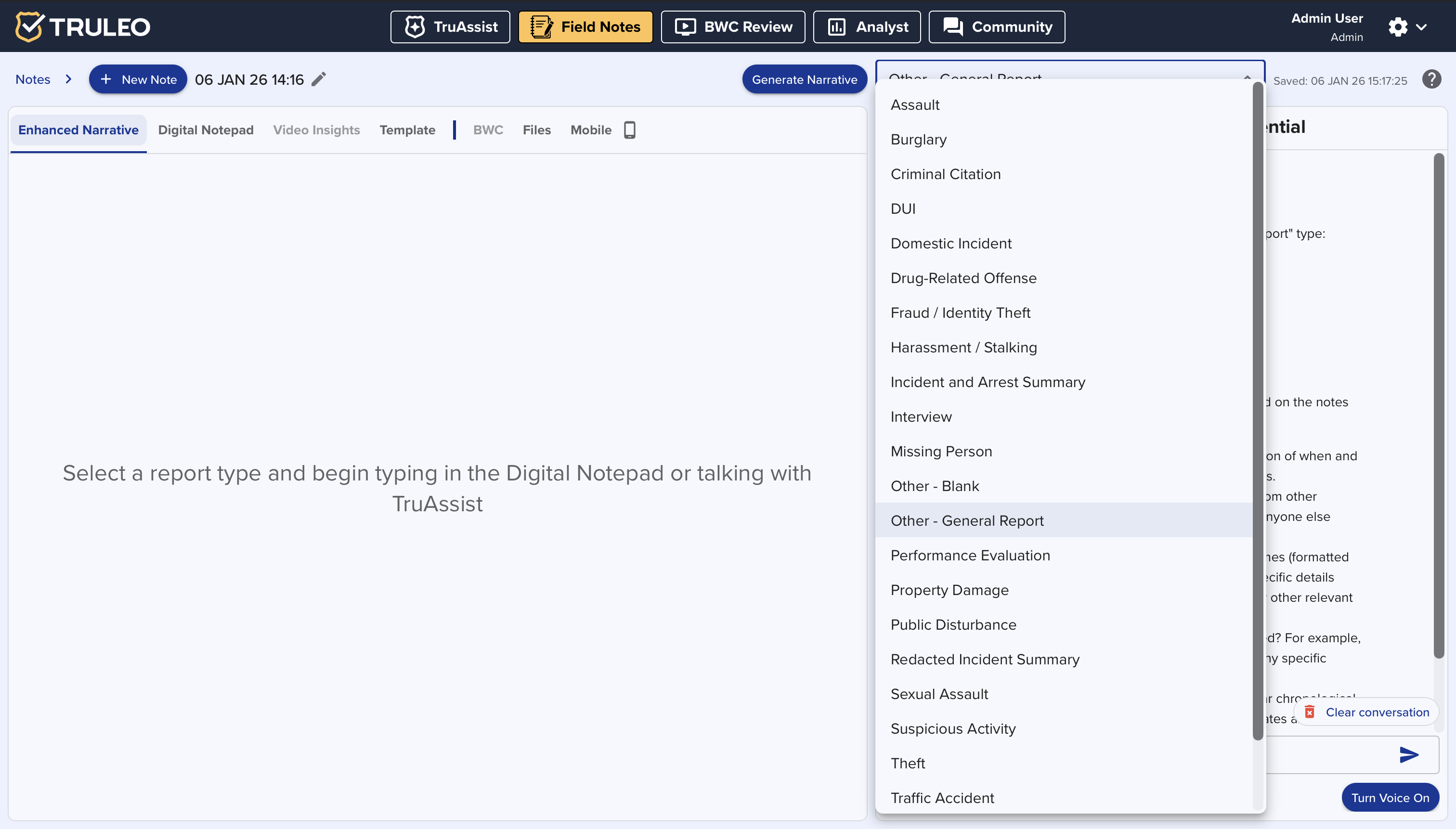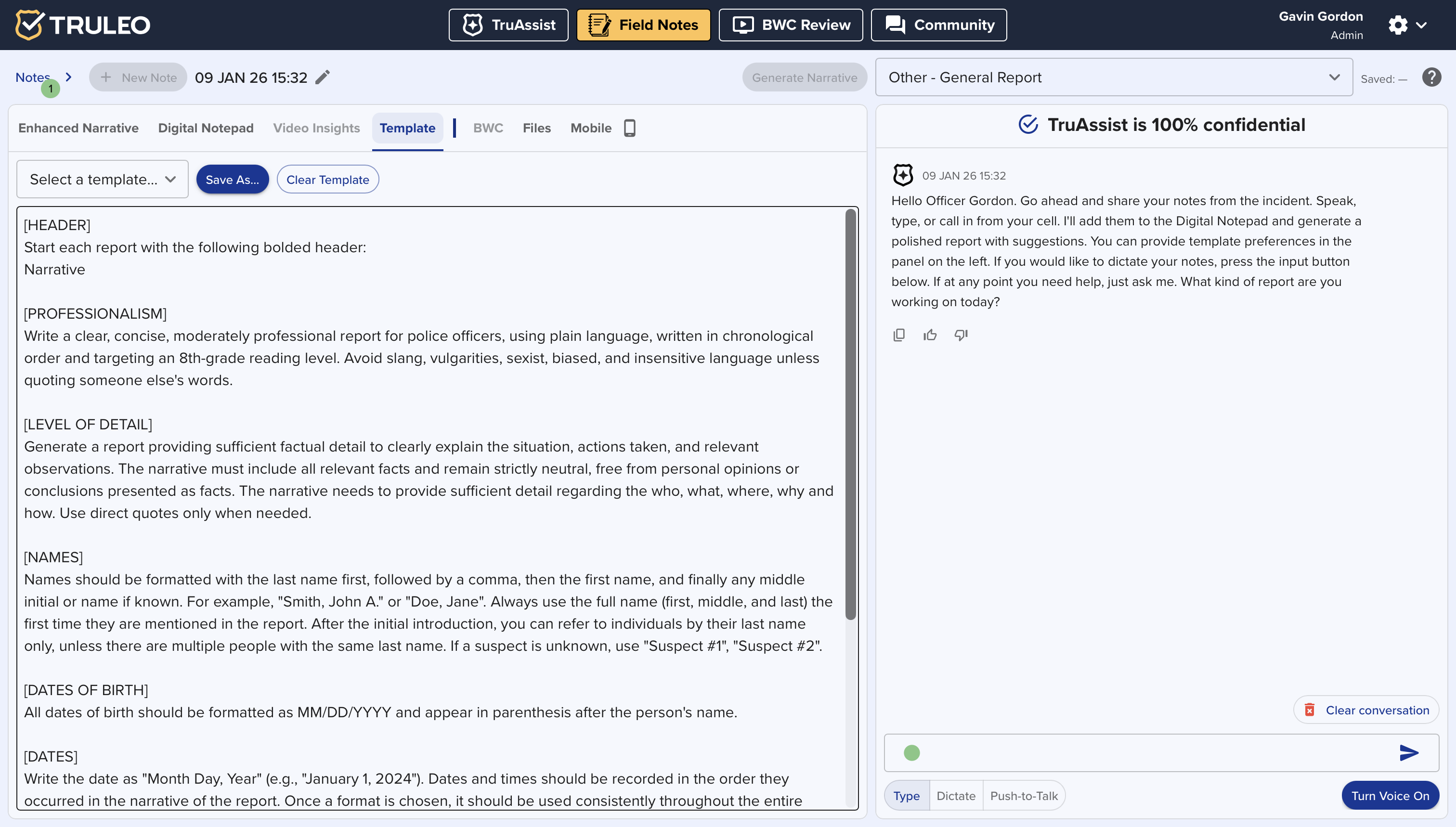 Field Notes is TRULEO’s workspace for building polished police reports.