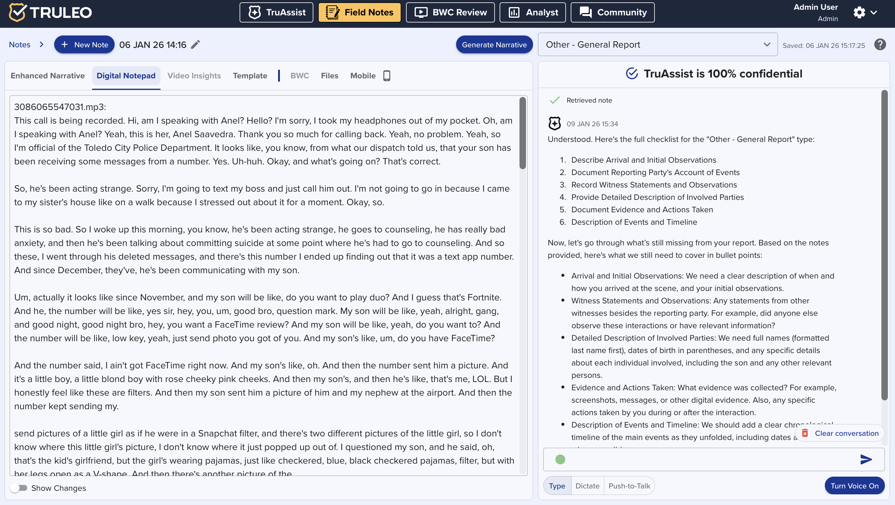 The Digital Notepad is where information is captured. Officers may speak into a microphone, type notes or paste transcripts from body‑camera videos or uploaded files. The notepad supports long‑form text and can include direct quotes. A checklist on the right highlights missing items based on the report type, guiding officers to gather all required details.