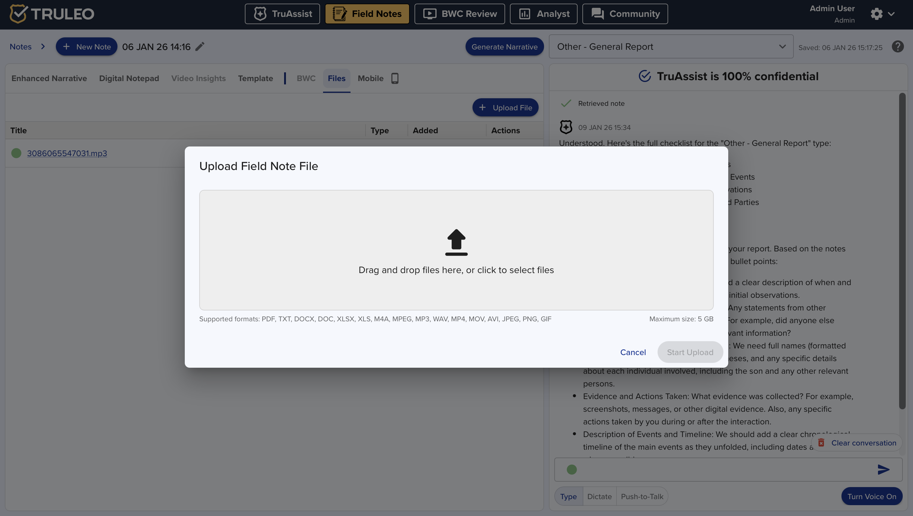 Through the Files tab, officers can attach documents, spreadsheets, audio or video files (up to 5 GB) in formats such as PDF, DOC/DOCX, XLS/XLSX, MP3, and WAV. Audio and video uploads are automatically transcribed and added to the notepad.