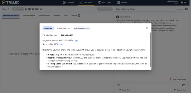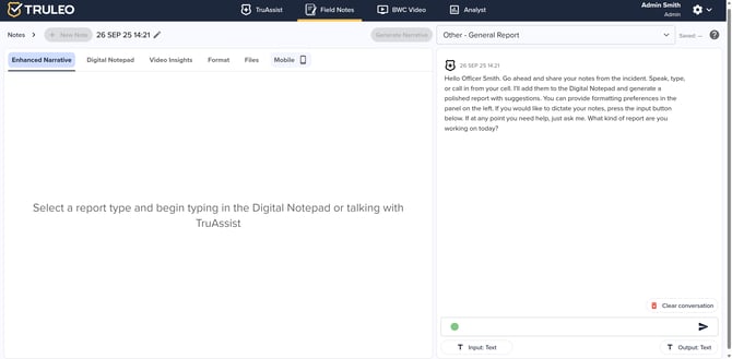 A message from TruAssist suggests that you can speak, type or call in your notes from your cellphone. TruAssist will place them in the digital notepad and generate a polished report with suggested formatting. Officers can also dictate notes using the input button below if needed.