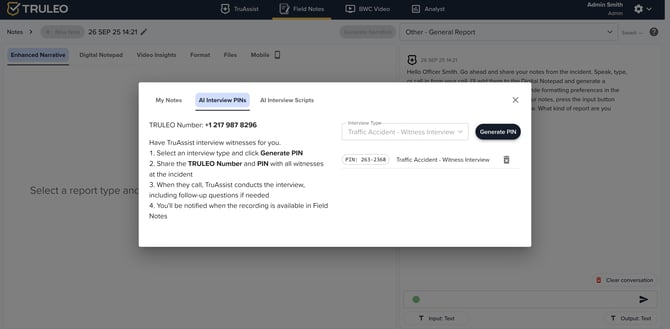 In the AI Interview PINs tab, TruAssist can conduct witness interviews for you.