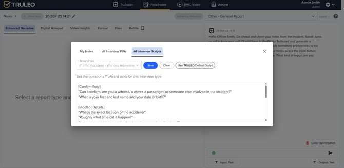 The AI Interview Scripts tab allows you to tailor the questions that TruAssist will ask witnesses.