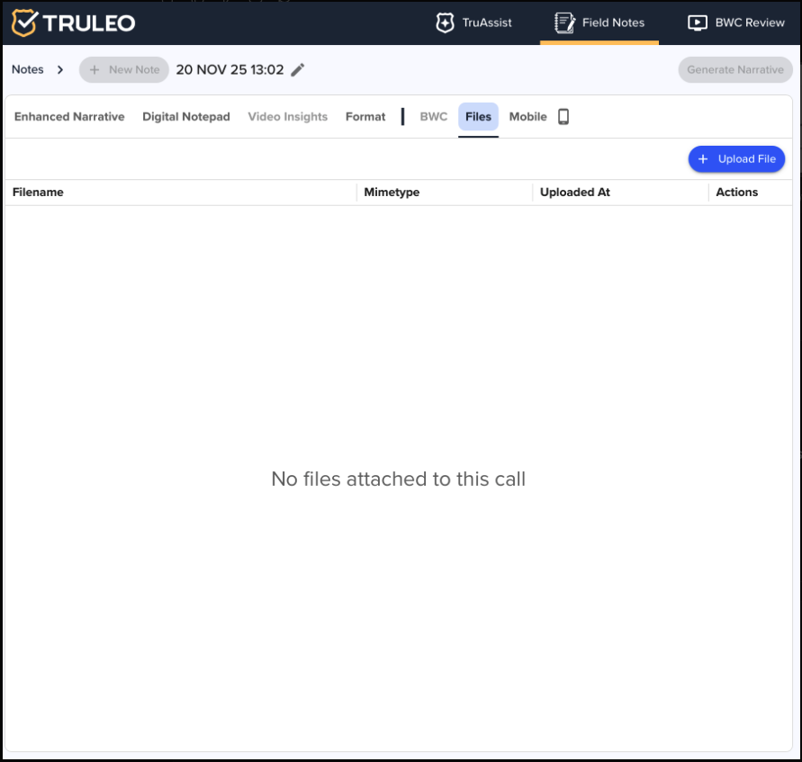 The Files tab in TRULEO Field Notes allows officers to upload supporting material—such as images, audio, documents, or video—directly into a report conversation. These files can later be referenced when generating an Enhanced Narrative or used by supervisors and analysts during review.