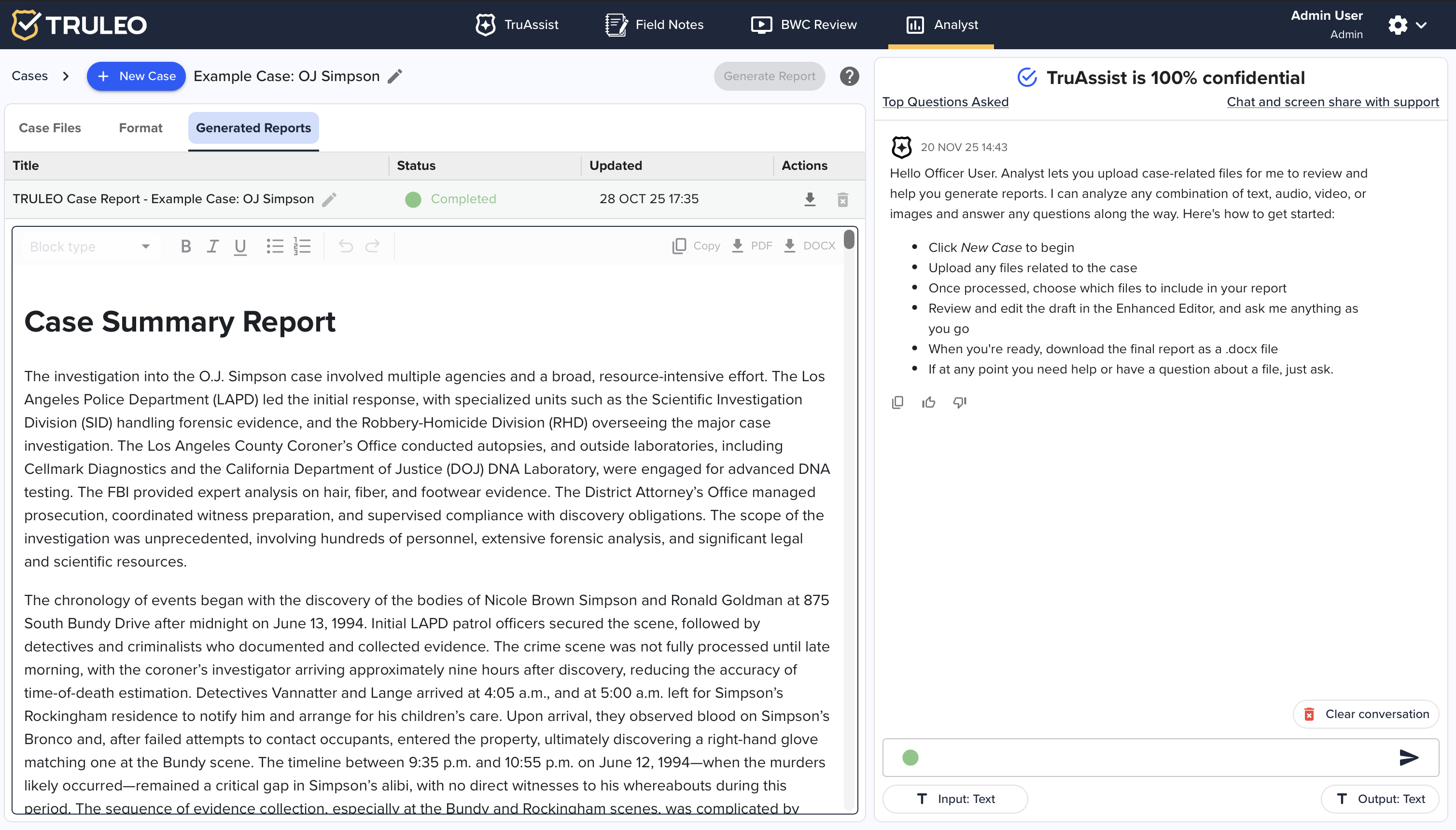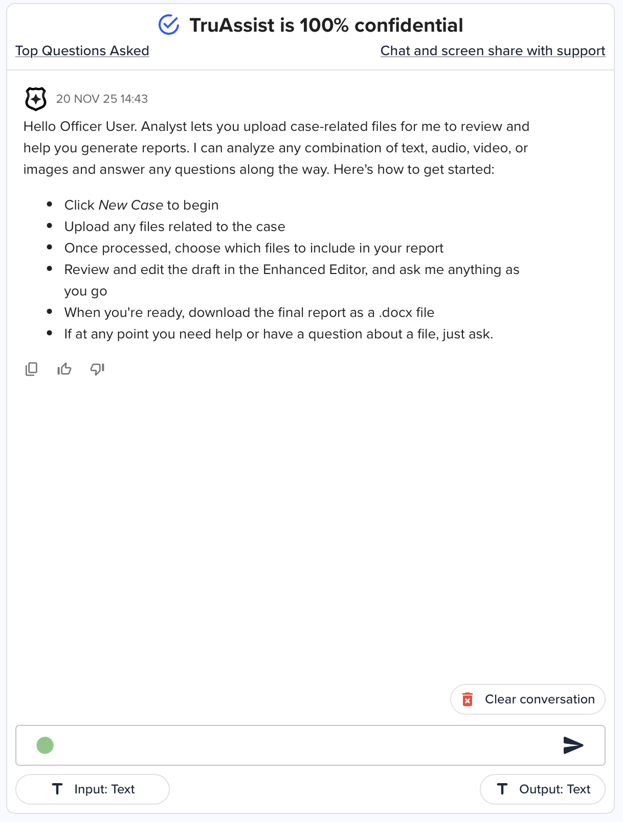 Analyst is TRULEO’s AI-powered assistant for reviewing case materials and generating high-quality written reports based on case files, RMS data, and uploaded documents.