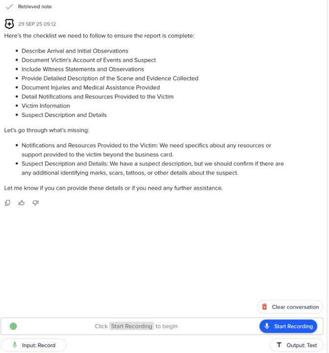 Field Notes in TRULEO not only helps officers structure their narratives through formatting templates, it also provides report checklists to ensure that every critical element is captured. These checklists appear in the TruAssist conversation panel when you select a report type. They act as a to‑do list for the report – you can compare what you’ve recorded against the checklist and fill in any missing details. Follow the steps below to view and use report checklists.