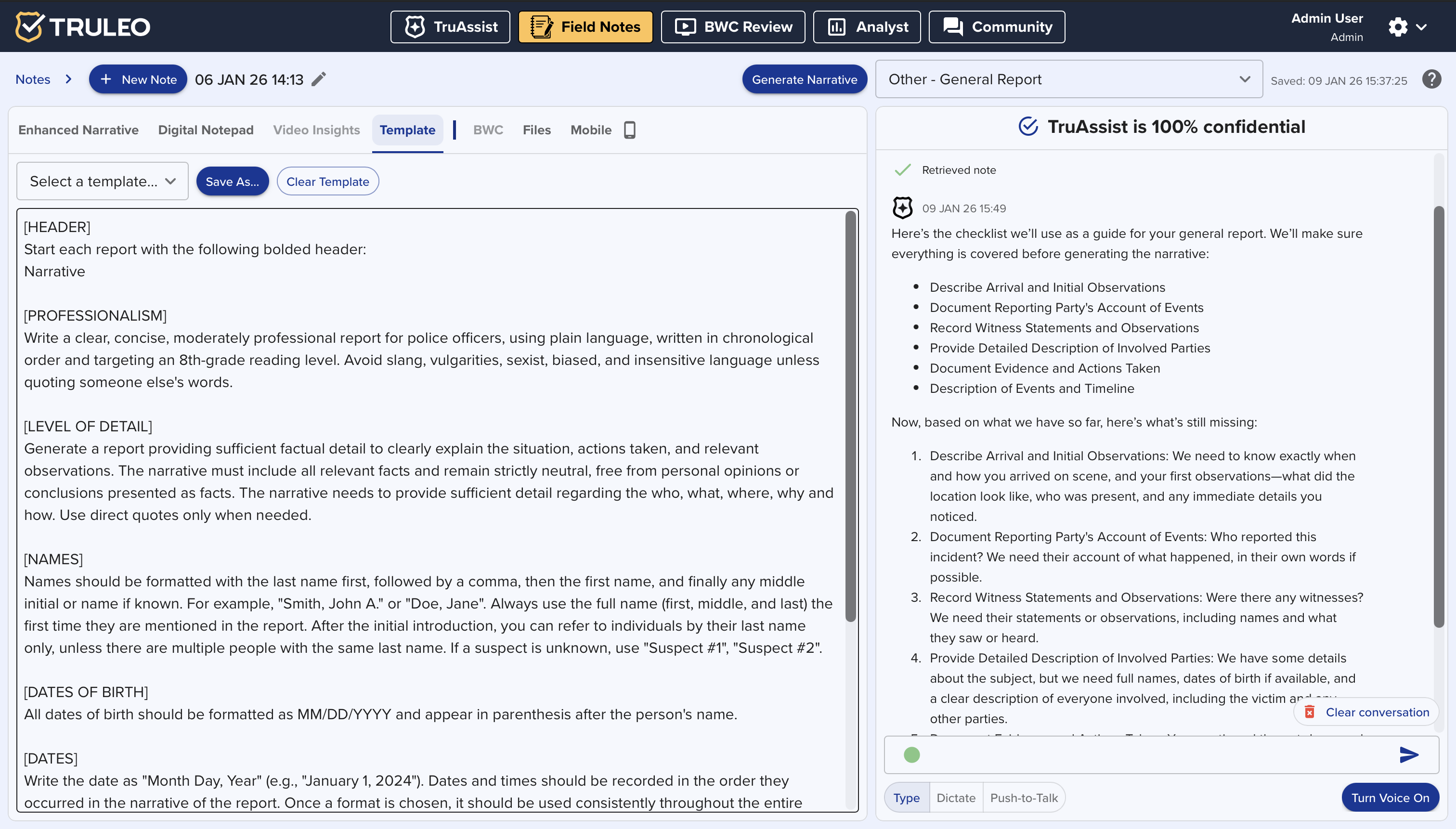 Field Notes in TRULEO provides officers with templates that outline how to structure narratives and set a consistent tone. The Template tab sits alongside other Field Notes tools (Enhanced Narrative, Digital Notepad and Video Insights). The Template dropdown lets you load agency‑approved templates, save your own formatting instructions and clear the current set of guidelines. The steps below show how to apply and manage Templates.