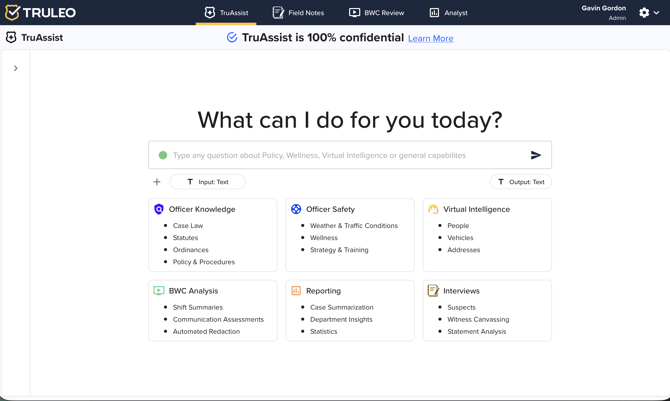 TruAssist is TRULEO’s conversational AI for law‑enforcement. It acts like a virtual dispatcher and research assistant that officers can interact with by voice or text. The system ties into CAD/RMS data, policies and statutes, so users can look up addresses, people or vehicles, pull call history, or ask about local laws while en‑route. It also offers anonymous wellness assessments and follows a zero data retention policy to protect privacy.