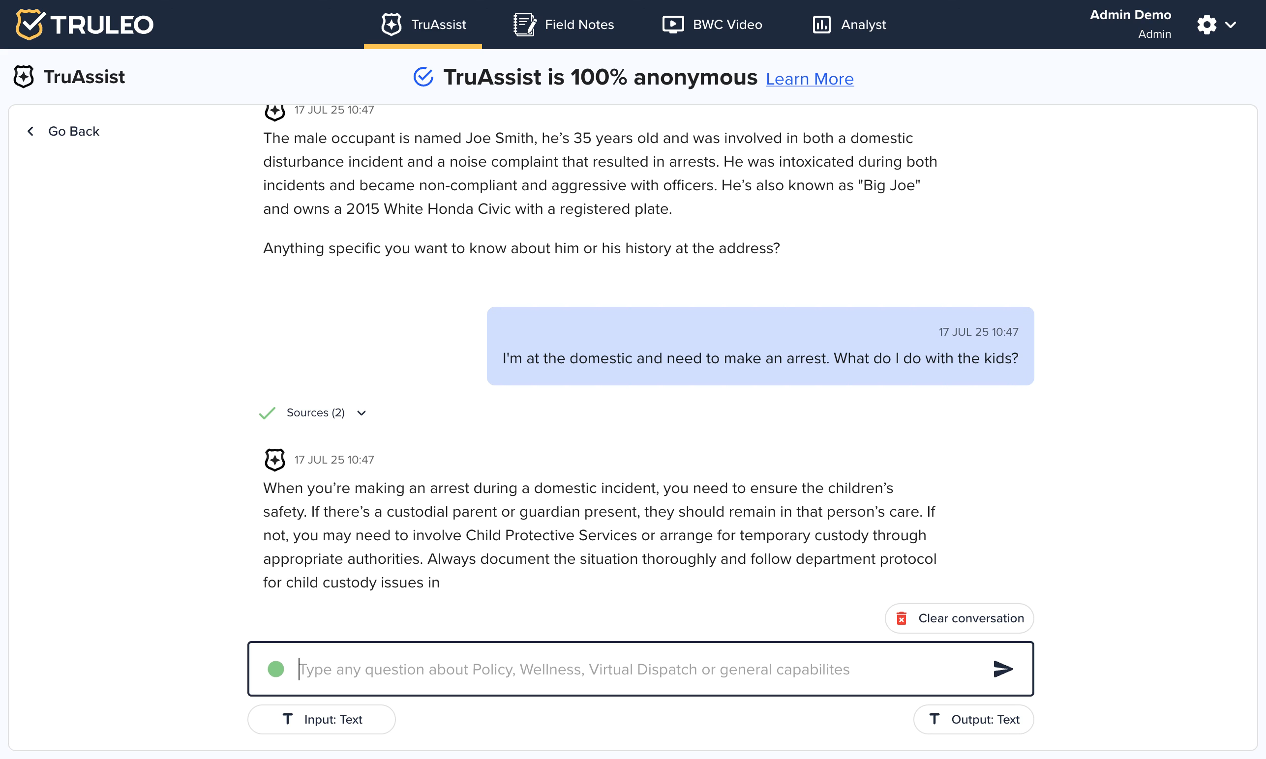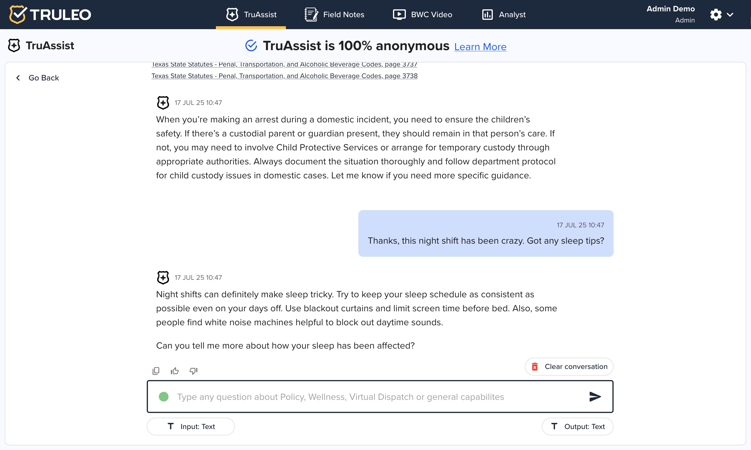 TruAssist provides clickable citations with its answers. A 2025 product update explains that every response now includes links that open the relevant statute or policy page. When officers ask, for example, how to handle children during an arrest, TruAssist displays a “Sources” section with links to the exact pages in the Texas State Statutes used to craft the answer. This lets users verify the advice and promotes accountability.